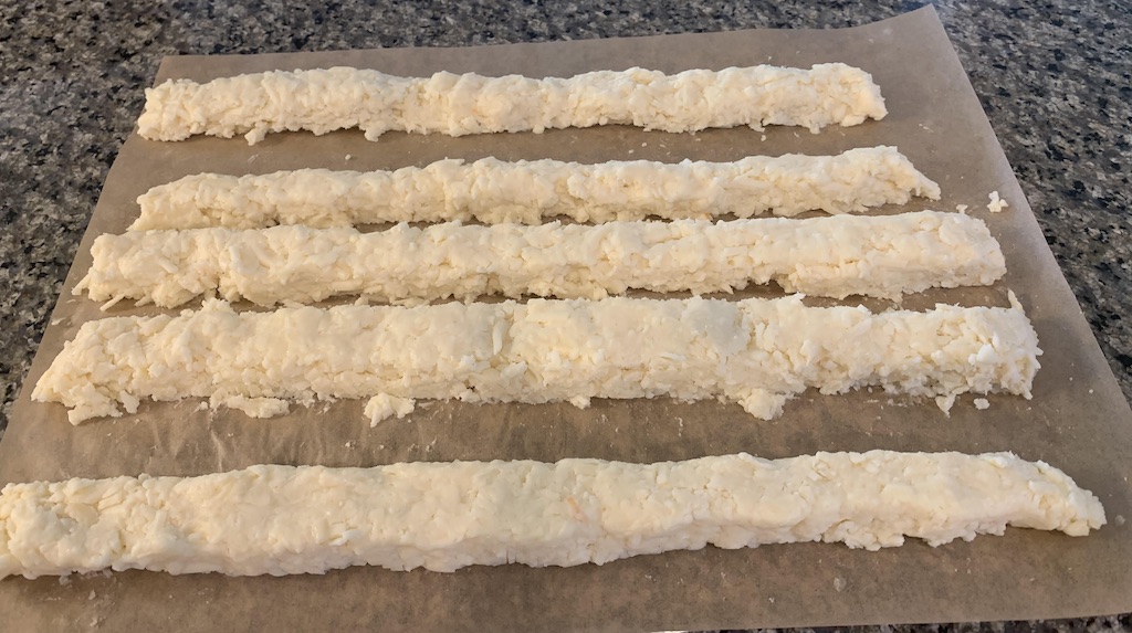 - On a piece of parchment paper, form the combined cheeses into a rectangle, about 15” long, and ¾” thick. (See Here)